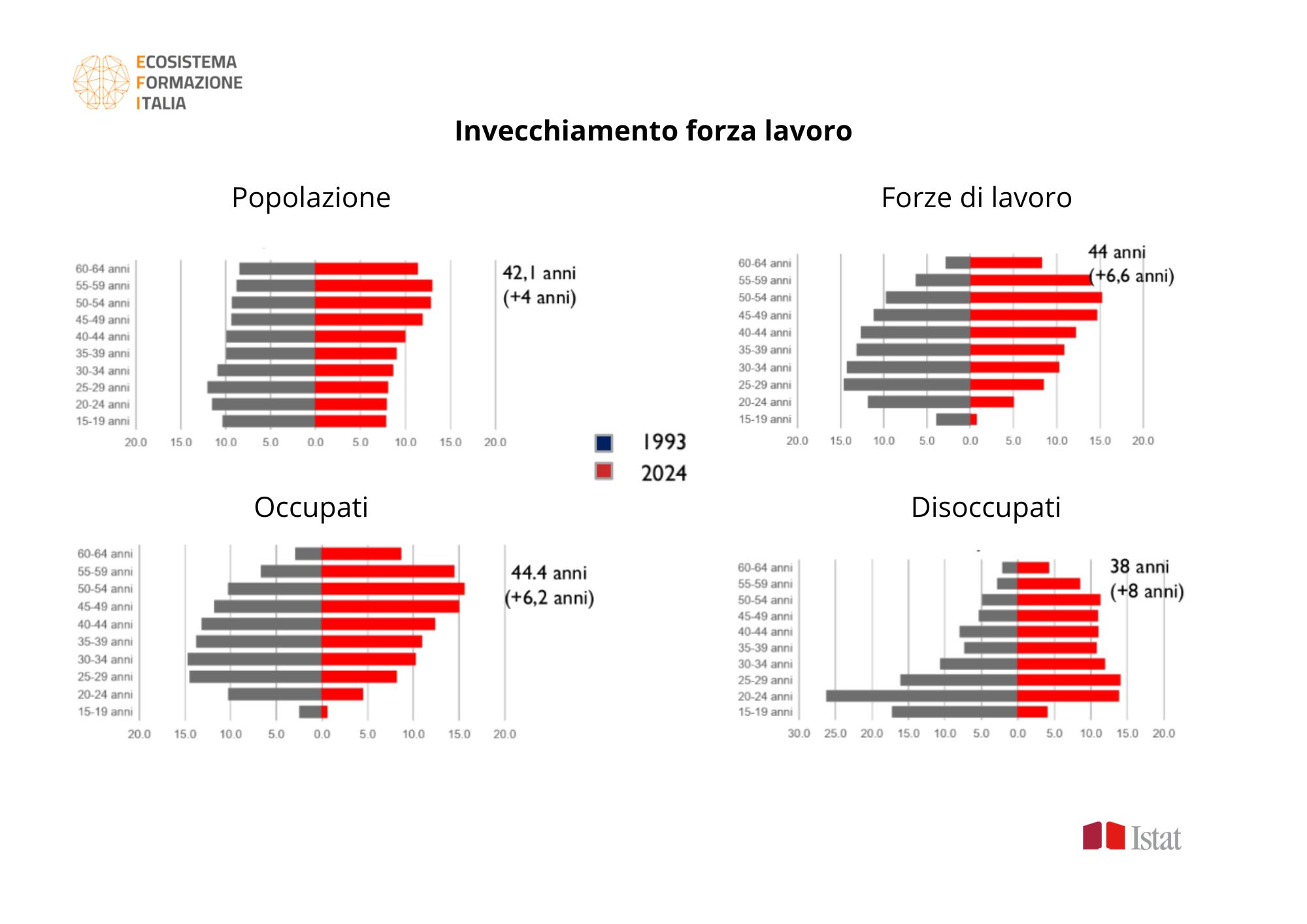 I dati Istat mostrano che, dal 2009, l’età media di chi lavora o cerca lavoro supera quella della popolazione generale. L’Italia, insieme alla Bulgaria, registra l’età media più alta per la fascia 15-64 anni: 44 anni, ovvero 1,8 in più rispetto alla media europea. A gennaio 2025, il nostro Paese conta oltre 24 milioni di occupati, 1,6 milioni di disoccupati e più di 12 milioni di inattivi.